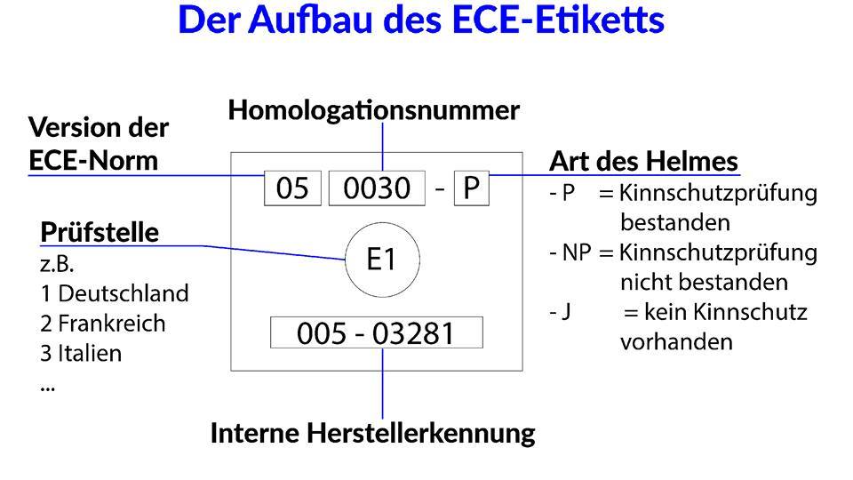 Die Information über die bestandene Prüfung liefert der Aufnäher am Kinnriemen oder im Futter (siehe Muster-Darstellung mit Erklärungen im Bild). Seit 2002 ist die fünfte Version der ECE-Regelung (ECE-R 22.05) gültig. ECE steht übrigens für „Economic Commission for Europe“. Diese Kommission definiert in der Regelung Nummer 22 die „einheitlichen Vorschriften für die Genehmigung der Schutzhelme für Fahrer und Mitfahrer von Motorrädern.