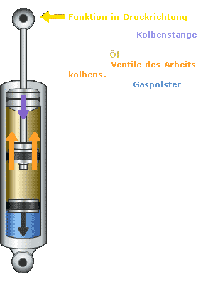 Dämpfer machen nichts anderes, als Energie umzuwandeln. Und zwar Bewegungsenergie (von der Feder) in Wärmeenergie. Fahrzeugschwingungen ziehen den Dämpfer auseinander (Zugstufe) oder drücken ihn zusammen (Druckstufe). In der Zugstufe übernimmt das Kolbenventil, in der Druckstufe das Bodenventil die Dämpfung.
